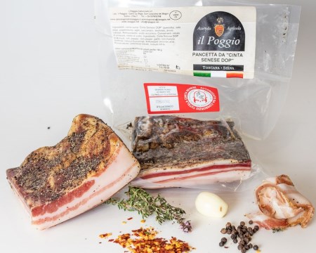 Cinta Senese bacon has a compact white fat with bright red strips of leaner parts. The raw material used, coming from outdoor breeding and the selected nutrition of the animals, give the final product an unmistakable and a unique taste. It is obtained exclusively from pure Cinta Senese PDO pigs slaughtered between 12 and 16 months. The first phase of the production process includes a preparatory massage to remove residual blood, and a washing with hot vinegar, garlic and local herbs. Subsequently, it is salted for 14 days with sea salt dosed in proportion to the weight of the piece. After salting, the pancetta is desalinated and left to rest for about two weeks at a temperature of 5/6 ° C and relative humidity around 60%.