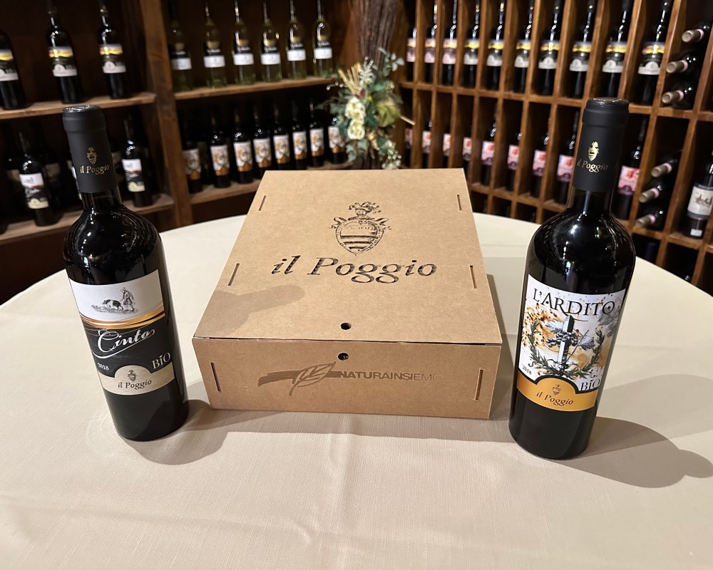 La confezione contiene: CANTUCCI ALLA MANDORLA GR.500 IL POGGIO SANTO VINO LIQUOROSO 0,375 LT.