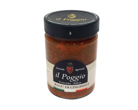 Carne di cinghiale 55%, Pomodori pelati, carne di bovino adulto 15%, concentrato di pomodoro, olio extravergine di oliva, vino rosso, carote, cipolle, sedano, sale, pepe, alloro, peperoncino, rosmarino, salvia.
